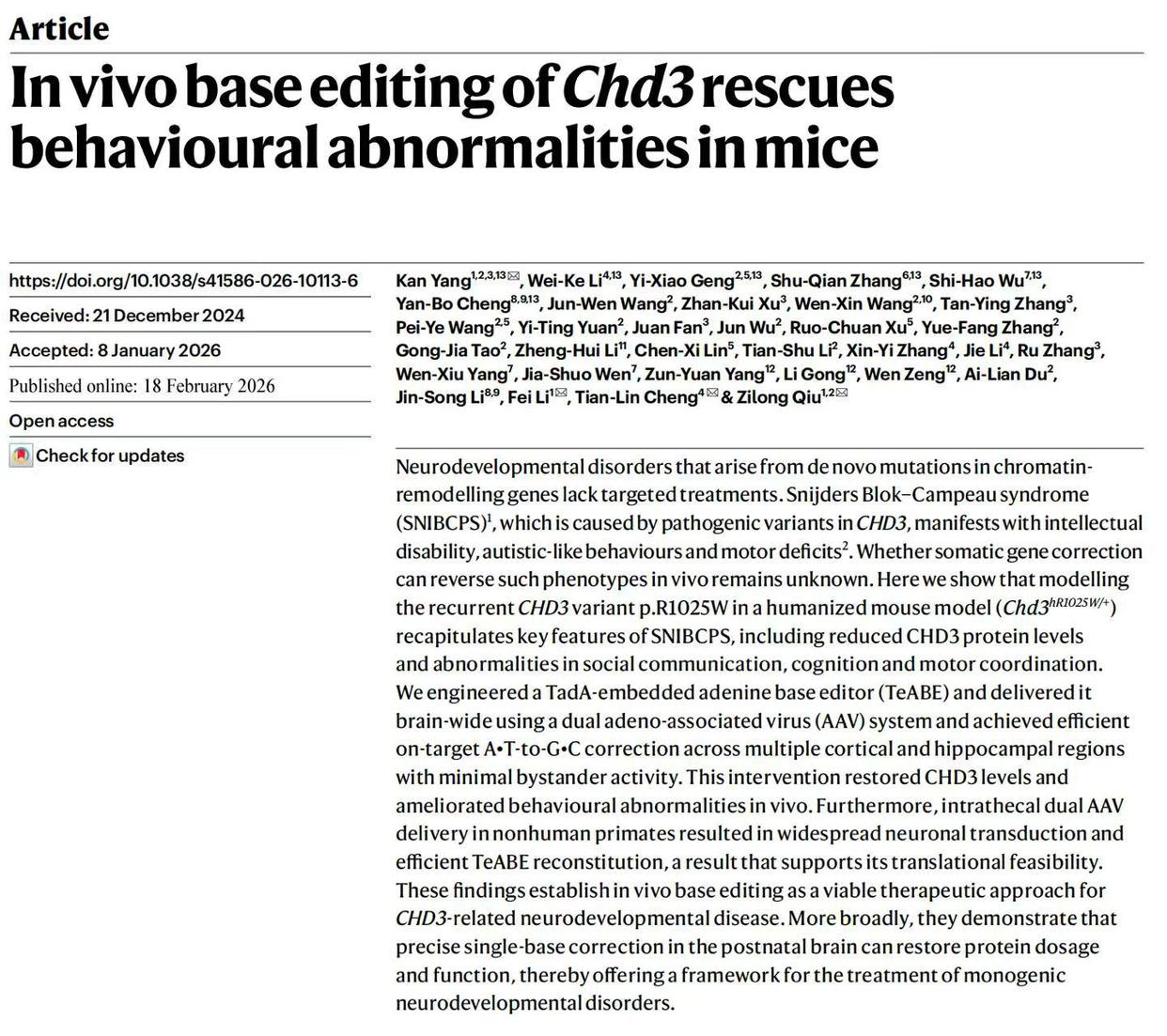 2月19日凌晨,国际顶级科学期刊《自然》刊登了由上海交通大学医学院附属新华医院发育行为儿童保健科及教育部-上海市环境与儿童健康重点实验室教授李斐、副研究员杨侃团队,与上海交通大学医学院松江研究院研究员仇子龙团队、复旦大学脑科学转化研究院研究员程田林团队和中国科学院分子细胞科学卓越创新中心李劲松院士团队通力合作完成的一项新成果:他们发明了一种办法,能钻进大脑里,把这个“错字”精准改回来。